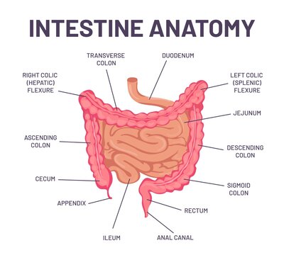 Intestine anatomy. Human body digestive system bowel infographic with duodenum, colon and jejunum. Internal abdominal organ vector structure