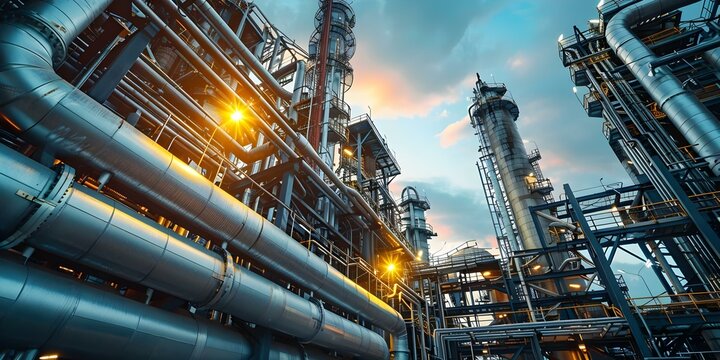 Steel pipes in an industrial zone at a petrochemical oil refinery. Concept Industrial Zone, Steel Pipes, Petrochemical Refinery, Oil Industry, Urban Landscape