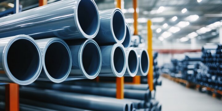 industrial storage of pvc pipes in a modern warehouse facility, durable construction materials, organized inventory management
