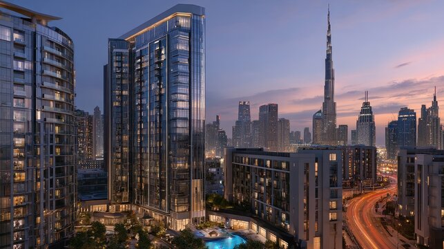 Stunning cityscape of modern Dubai buildings with the Burj Khalifa at dusk