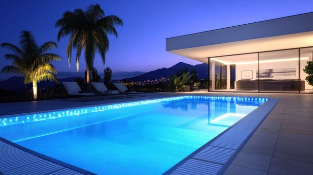 Modern house exterior featuring a wavy textured wall, stylish lighting fixtures, and lush landscaping, creating an elegant ambiance at dusk with a welcoming pathway