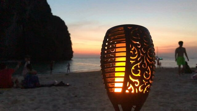 4K sunset on the beach shot at Phra Nang Beach Krabi Thailand. Close-up flame of a torch candle with people sitting around.