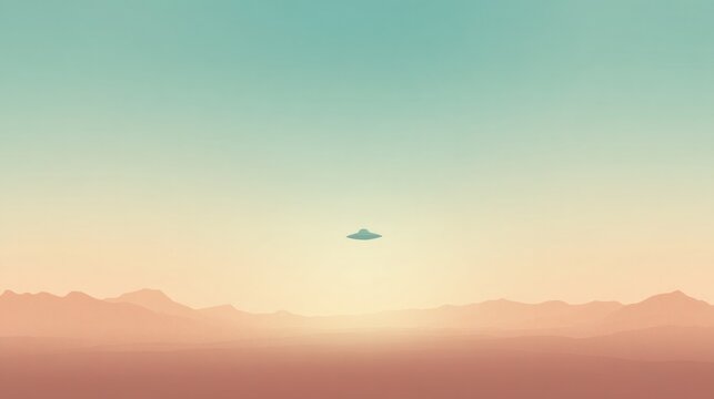 single ufo silhouette hovers over vast deserted landscape at dusk with pastel sky tones creating mysterious ambiance