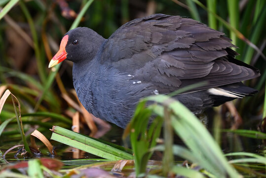 Dusky moorhen, standing in shallow water, looking out from behind bright green reeds