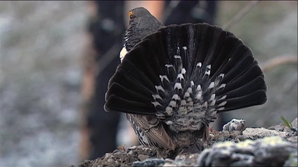 Dusky Grouse (Dendragapus obscurus) turns to show close-up of face, zooms out for full bird view, 2013
