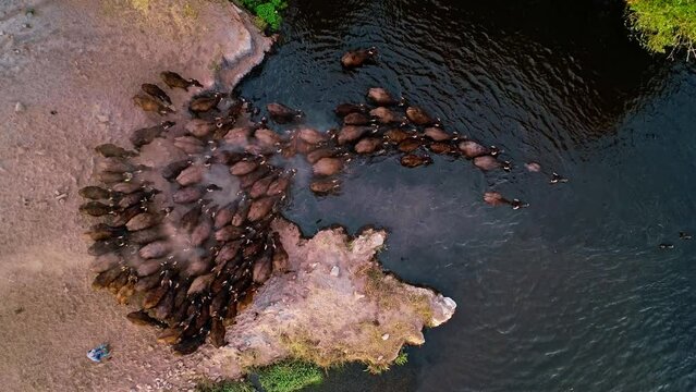The buffaloes that come out of the farms at sunrise go to graze on the pastures and return to the farm at sunset. Aerial view of a herd of buffaloes cooling and swimming in the lake.