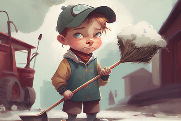 Cute child is a cleaner or dustman. Illustration for a children's magazine or book about different professions of people.