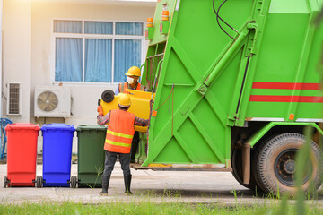 Two sanitation workers collaborating to unload garbage bins onto a truck for waste disposal.