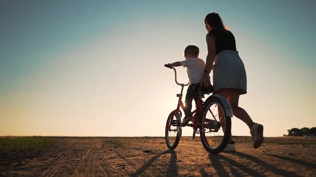 Teaching child to ride bicycle mother supports child with patient help on dusty road at sunset silhouette showing family lesson in balance and training outdoor play and trust building together