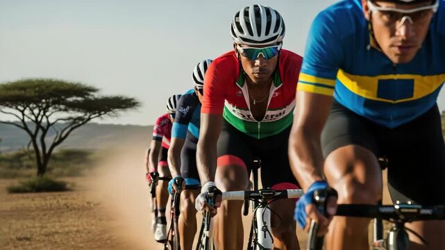 Cyclists competing in cycling race across dusty terrain, cycling race showing determination and physical effort, with bikes and colorful team jerseys.