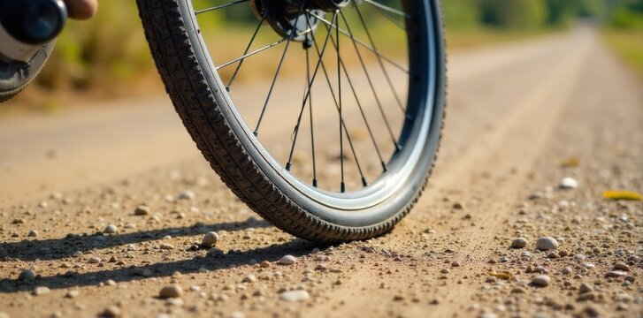 Dusty Bicycle Wheel on Gravel Path Close up, static shot of a bicycle wheel resting on a dusty gravel path. Natural light illuminates the texture of the dust and gravel, with the wheel hub and spokes