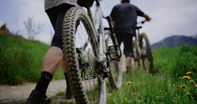 Group of mountain bikers walk up along dusty dirt trail, low angle rear follow