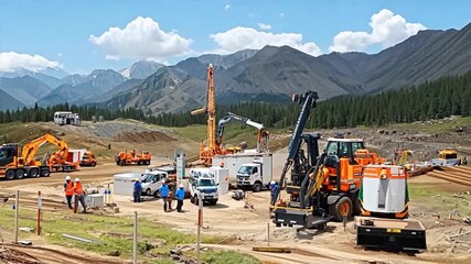 Weathered steel-toed boots standing upright amidst scattered construction tools and debris on a rugged concrete construction site background.