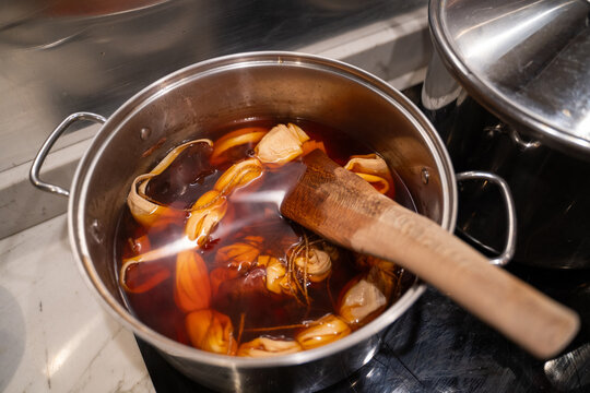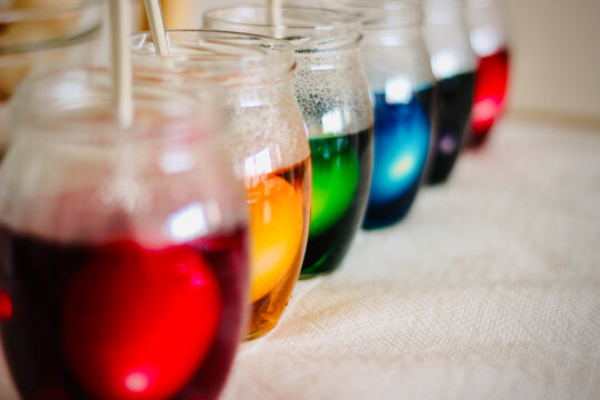 Close-up of a row of glass jars filled with multi coloured dye for dying Easter Eggs