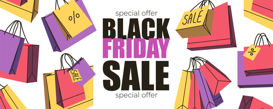 Black Friday Sale Banner with dynamic pattern of multiple floating yellow, pink, and purple bags