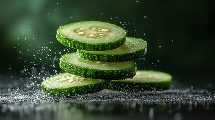 Flying cucumber slices in mid-air, symbolizing freshness, vitality, and healthy living, perfect for dynamic advertising design focused on modern food products or lifestyle.