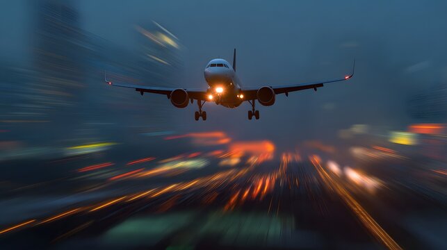 Dramatic airplane landing at night with blurred city lights and motion effect.