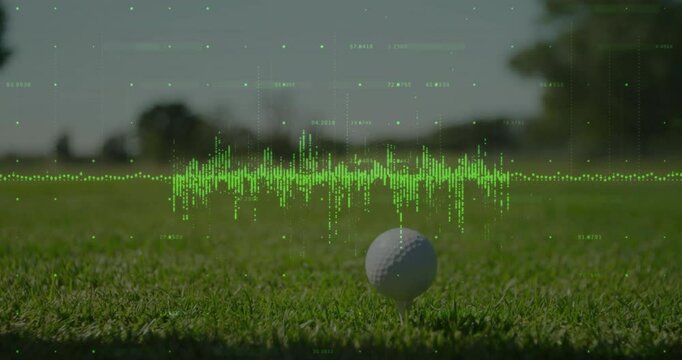 Male golfer initiating driver swing behind ball on tee, waveform fluctuating for shot analysis