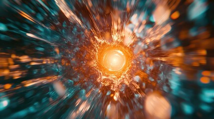 Abstract illustration showing a powerful orange energy burst expanding rapidly and creating a dynamic effect with glowing particles and blue streaking lines suggesting speed and technology