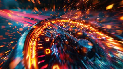 Digital speedometer neon light concept on a dark black and red background technology illustration
