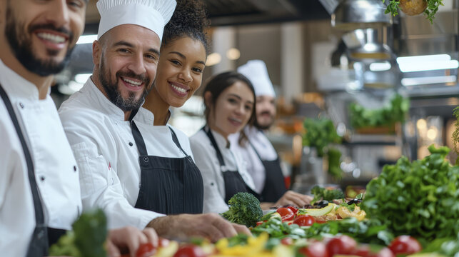 Chefs smiling in kitchen with fresh vegetables, showcasing teamwork and culinary skills
