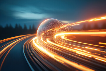 glowing sphere of light trails along futuristic highway, symbolizing speed and technology. dynamic scene captures essence of innovation and digital transformation