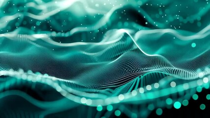 Abstract digital landscape with dynamic waves of light and dots in turquoise and white, 4k video