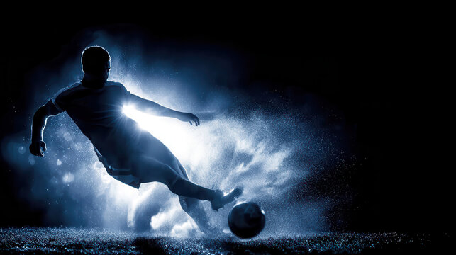 Professional soccer player kicking a ball with dramatic lighting and dust effect, creating a powerful and dynamic sports image, ideal for advertising campaigns and editorial use