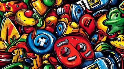 Energetic graffiti-style pattern, vibrant colors, including skateboards and game controllers