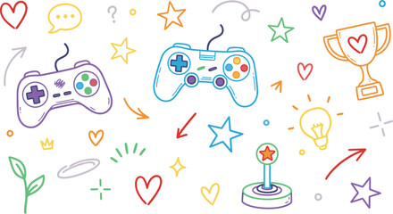 Vibrant Hand Drawn Game Controllers and Icons Surrounding Trophy on White Background