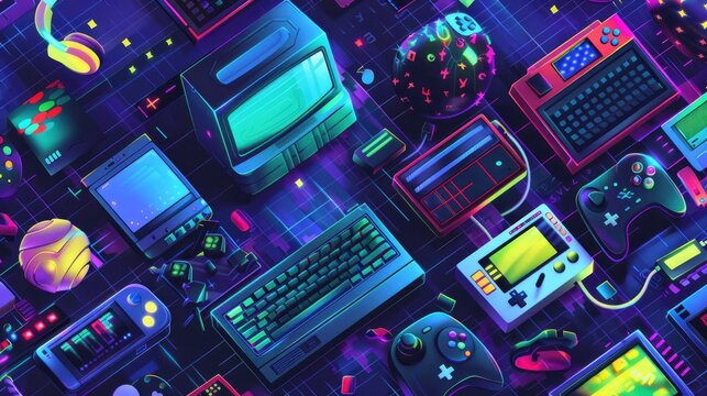 Abstract gaming background with vibrant purple and red neon outlines of game controllers and other gaming symbols on a dark background