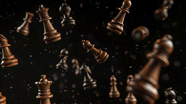 Suspenseful chess pieces falling in dark space, concept of strategy and challenge. a dynamic chess game freeze frame. AI