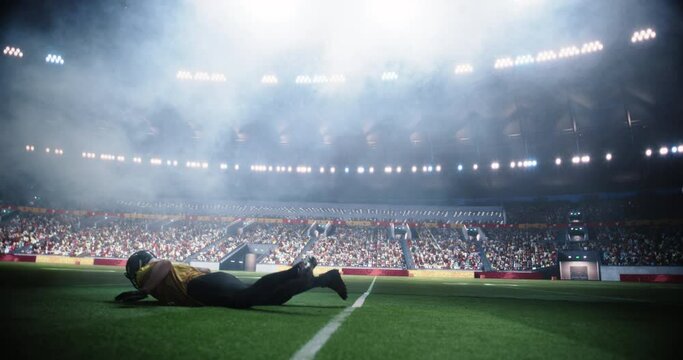Two Diverse American Football Teams Play a Dynamic Match in Front of a Stadium Filled with Spectators. Players Pass, Jump, Run, Attack to Score Touchdown Points for the Championship