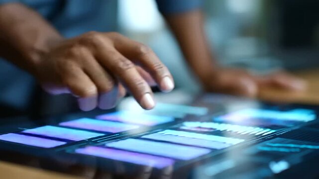 Data Analysts Works on Futuristic holographic interface showcasing dynamic business analytics and data visualization., Using Data Visuals, Touch Gestures, and Real-Time Feedback in Modern Workspace