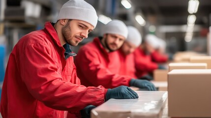 Workers in red uniforms efficiently handle boxes within a factory environment, showcasing teamwork and productivity in a dynamic setting.
