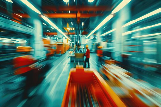 Blurred view of a busy industrial warehouse with workers and machinery in action, showcasing productivity and efficiency