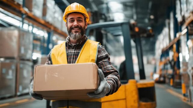 Hardworking professional lifts packages with a smile in a busy warehouse environment during the day, showcasing dedication and teamwork among colleagues