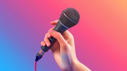 Close up woman hand holding High quality dynamic microphone and singing song or speaking talking with people on isolated white background. Woman testing microphone voice for interview