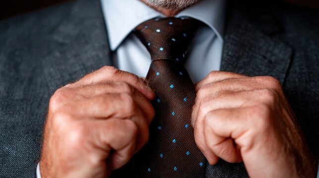 A close-up of a well-dressed businessman adjusting his tie, reflecting professionalism, confidence, and sophistication in a corporate environment.