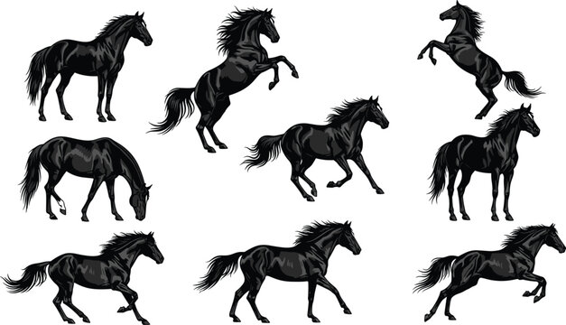 Black horse silhouettes in dynamic poses — running, rearing, grazing, and trotting — powerful equine forms for equestrian, wild, or design themes.