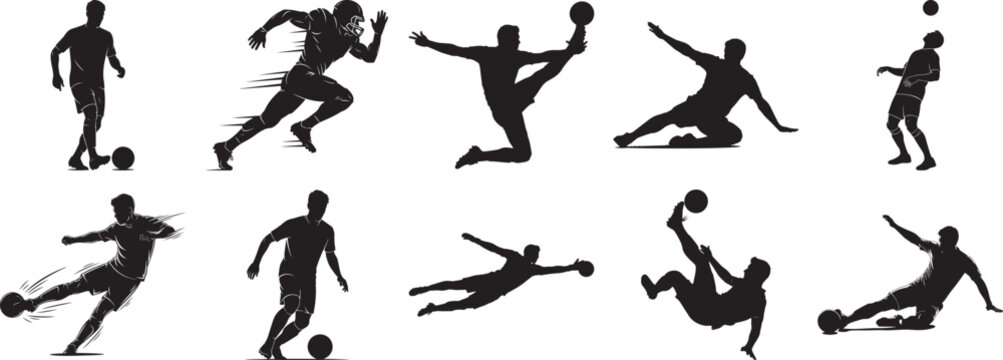 Soccer player action silhouette vector set with dynamic football kicking and running gameplay poses