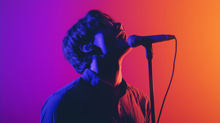 A dynamic image of a Caucasian singer passionately performing into a microphone, set against an intriguing gradient background of orange and blue hues, evoking a lively atmosphere.