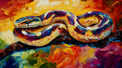 Vibrant snake coiled on a branch, rich colors and texture.  Bold strokes create a dynamic image of the reptile, set against a background of vibrant hues