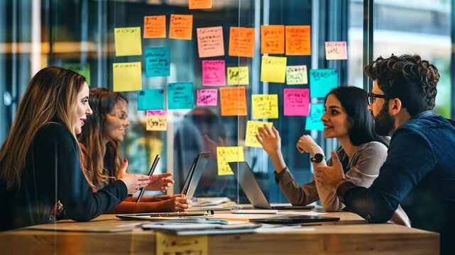 Collaborative brainstorming session office space sticky notes wall creative environment close-up view teamwork inspiration
