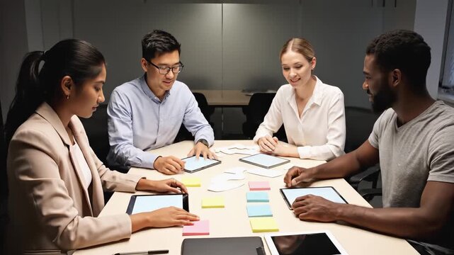 A dynamic office scene showing a team of young professionals engaged in a brainstorming session, utilizing digital devices to enhance their work flow and communication.