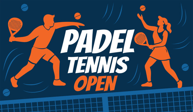 A vibrant vector banner for the Padel Tennis Open. Sporty style, dynamic player silhouettes, and rich orange and blue colors create a modern design for advertising a padel tennis tournament or club