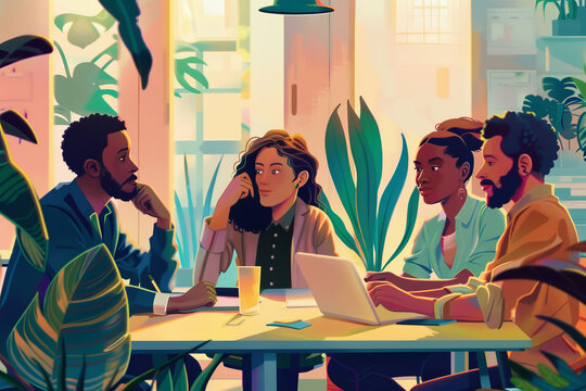 A focused creative team engaged in a brainstorming session in a plant-filled cozy workspace environment. Diversity people in corporate.