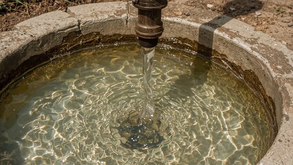 Manual hand pump drawing polluted spring water with dark yellow-brown discoloration, indicating toxic contamination and health risks such as jaundice and dysentery
