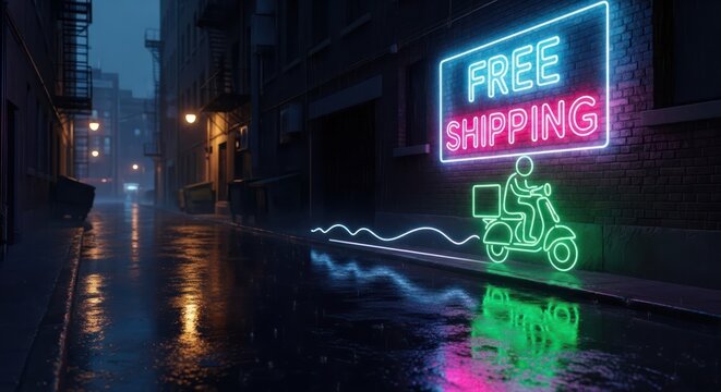 Neon glow of free shipping announcement lights up a rainy urban delivery scene