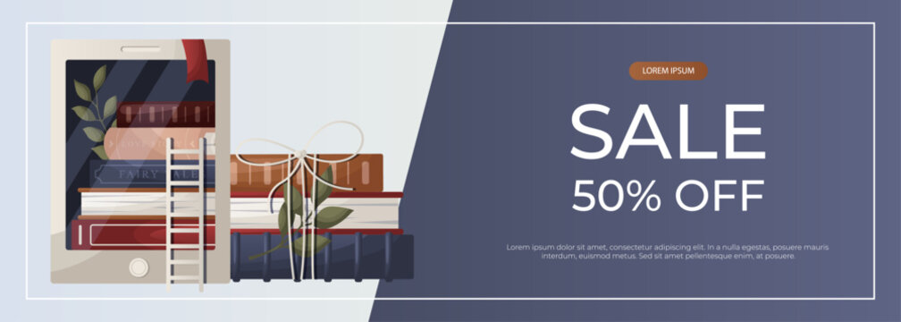 Promo sale banner with electronic ebook reader, stack of books, bow, plant. World book day.  Book heap. Bookstore, bookshop, library, book lover, bibliophile, education. A4 vector for poster, cover